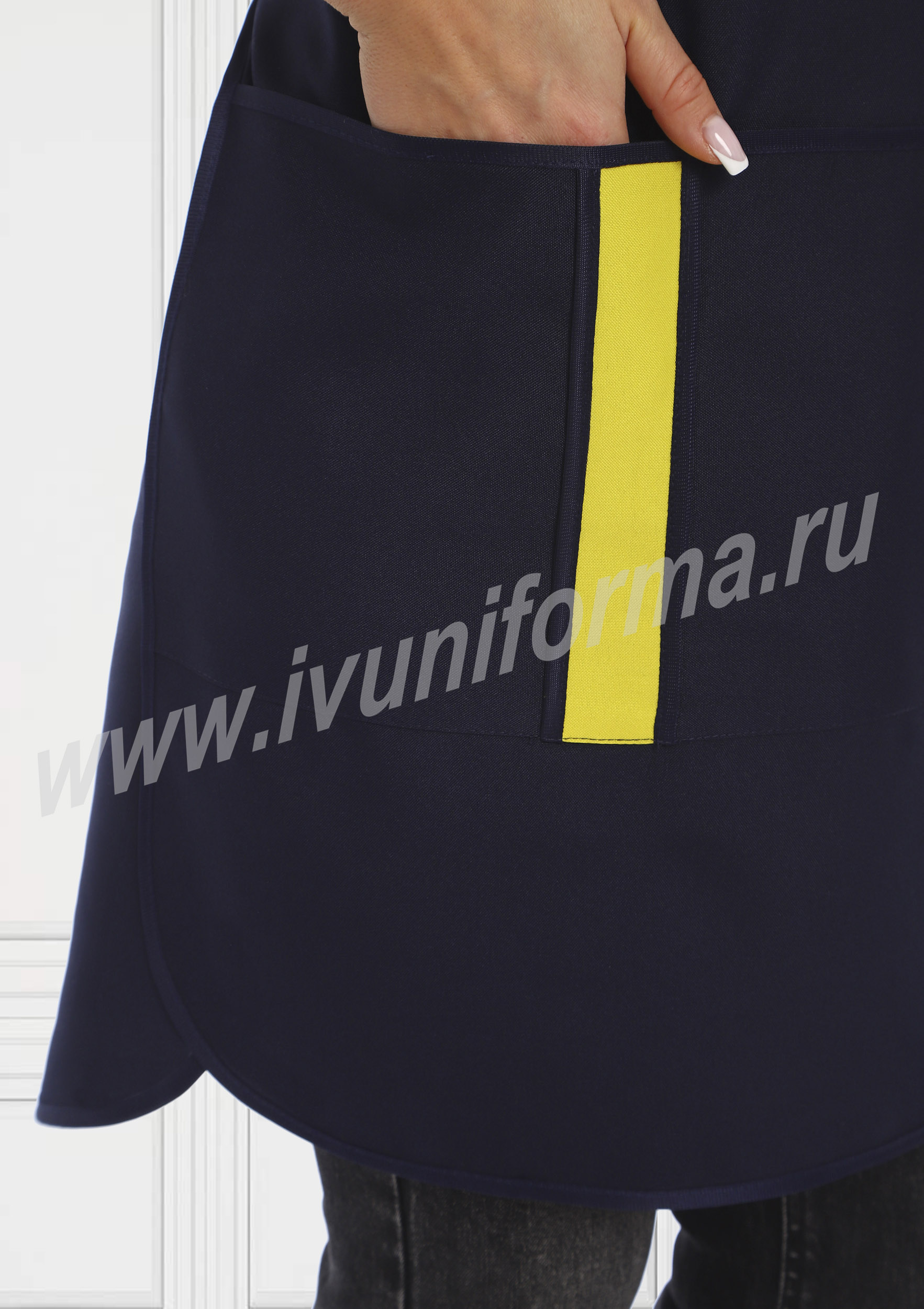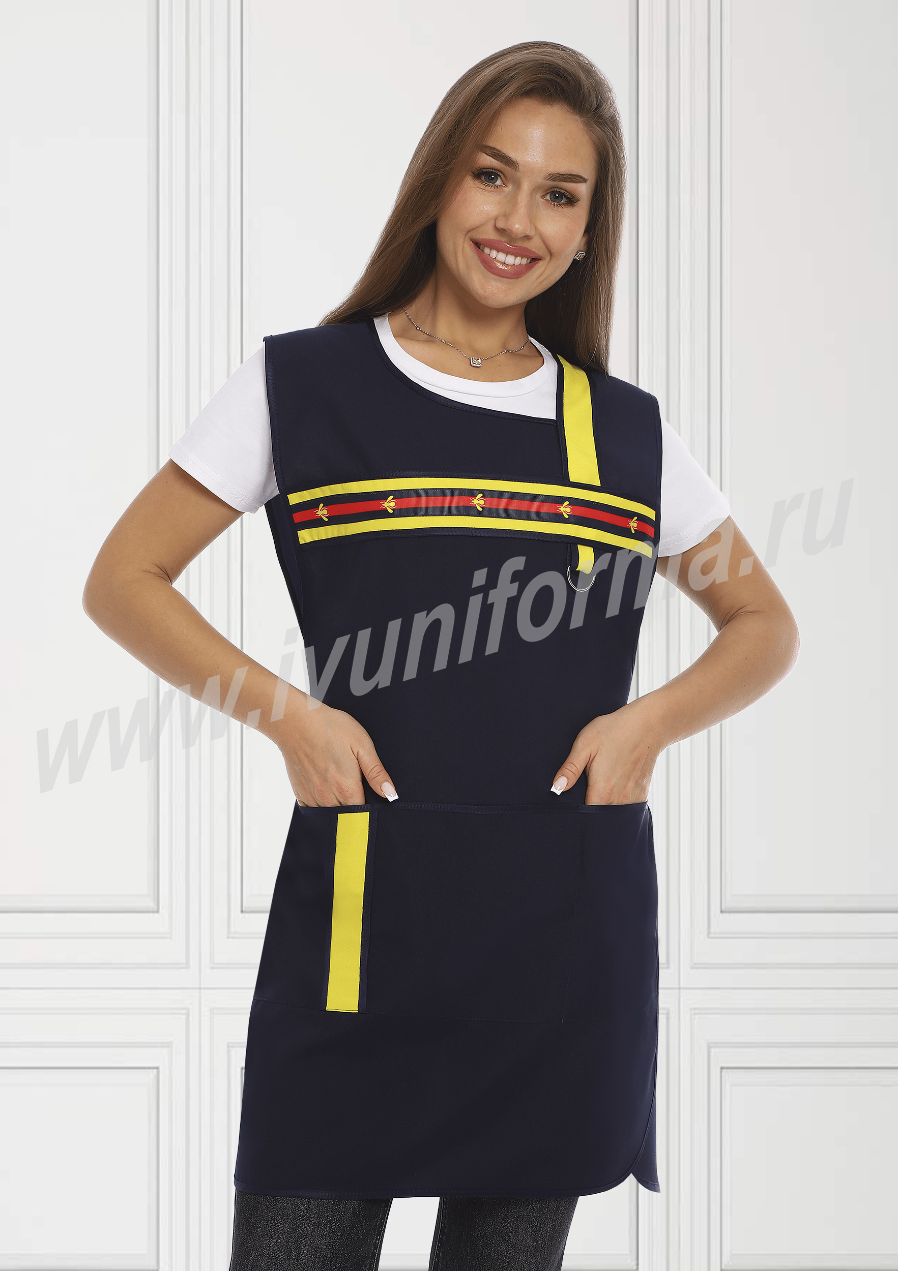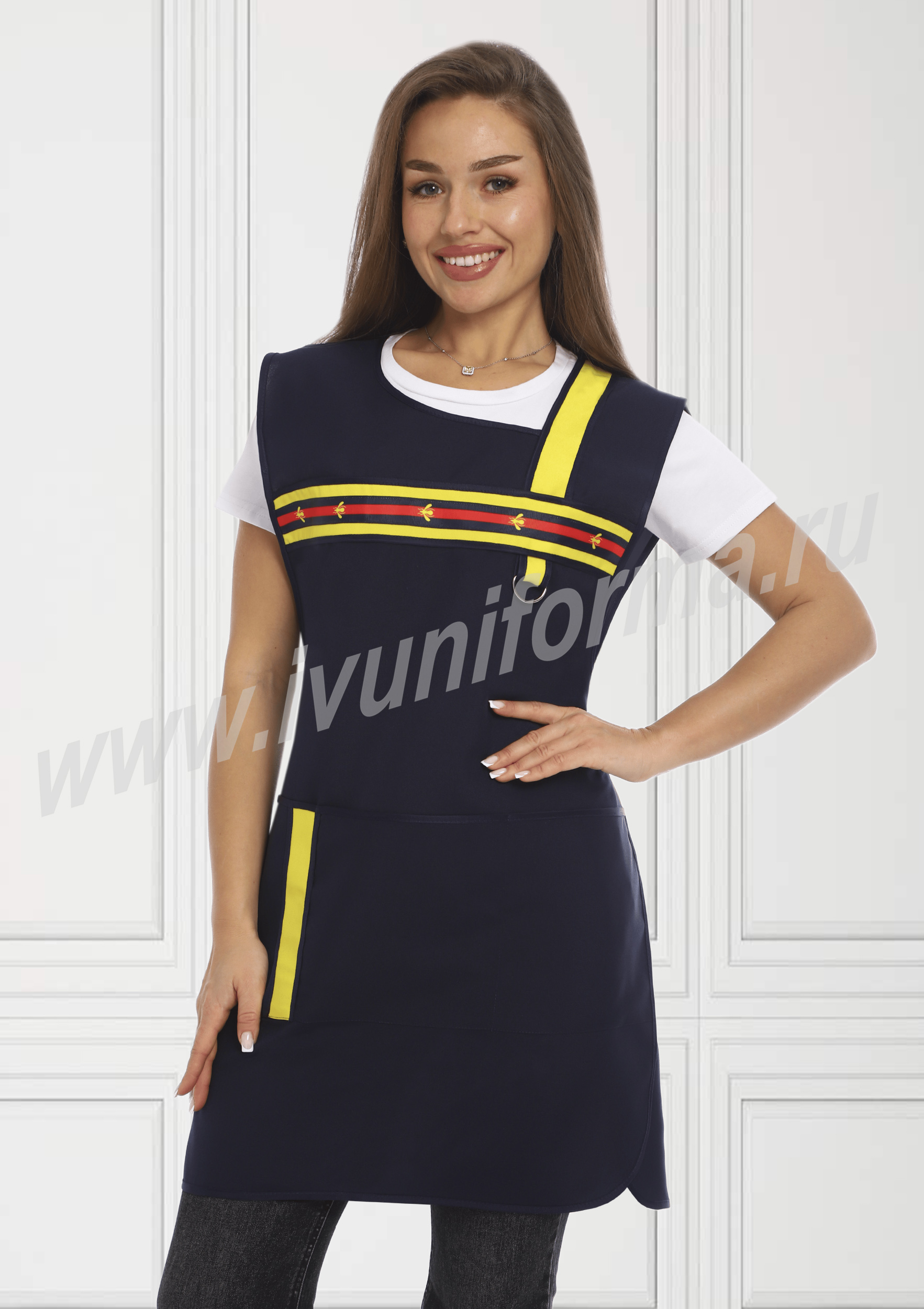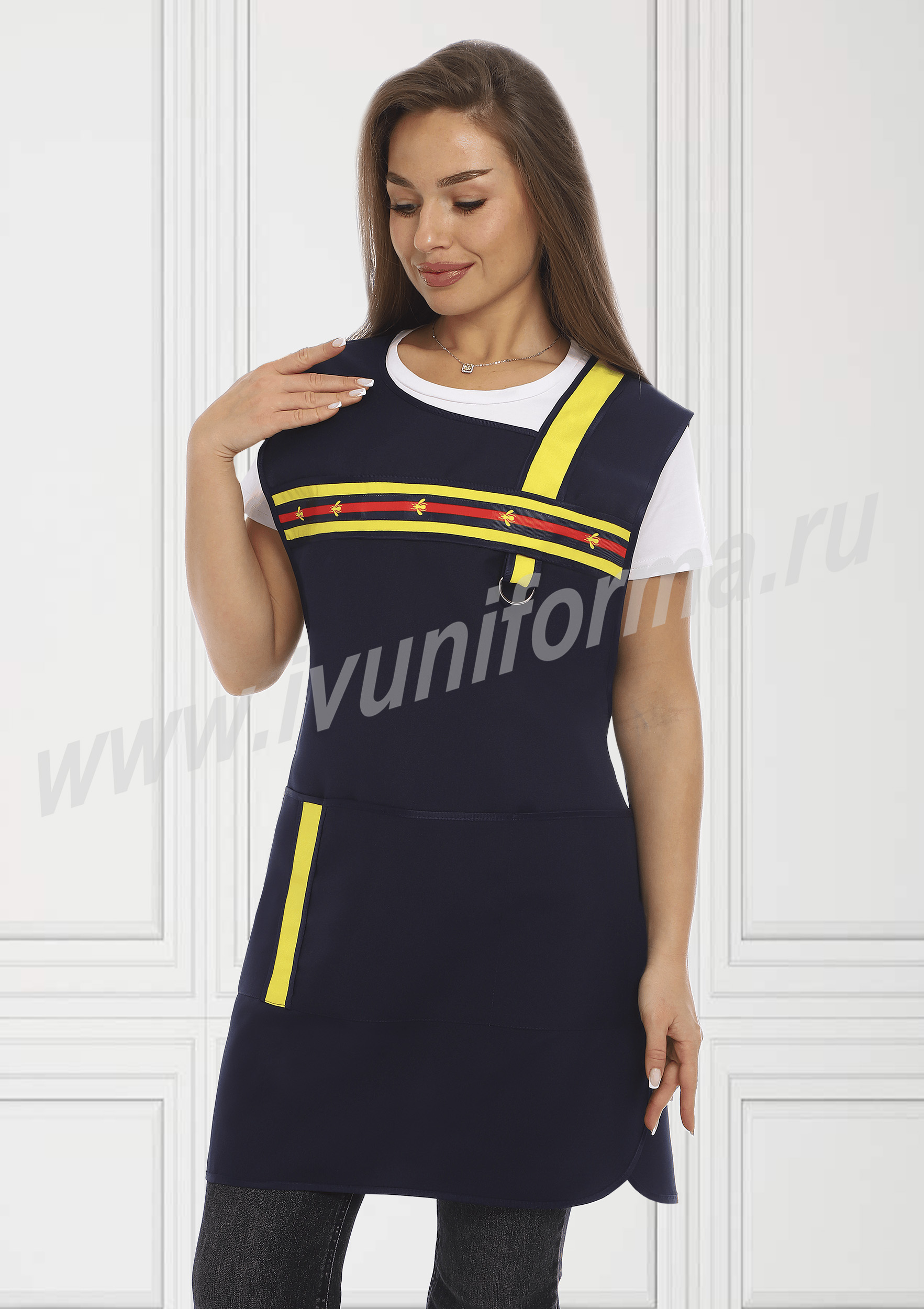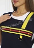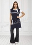 Фартук средней длины, перекидной с фигурным вырезом горловины. Спинка прямая без отделки. Полочка с отрезными асимметричными кокетками, в нижней части фартука расположен вместительный карман с тремя отделениями. Ширина фартука по линии талии регулируется завязками – полупоясами. Оригинальная отделка контрастными полосами и яркой тесьмой с принтом подчеркивает оригинальный дизайн изделия. Все срезы фартука обработаны кантом из износоустойчивой нейлоновой ткани. Фартук прост в уходе, не мнется, не линяет, удобный и практичный, предназначен для защиты от общих производственных загрязнений.