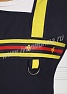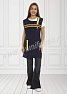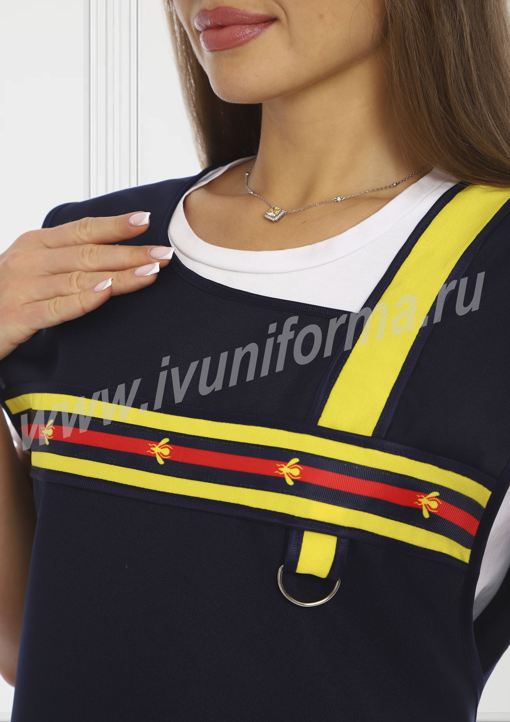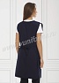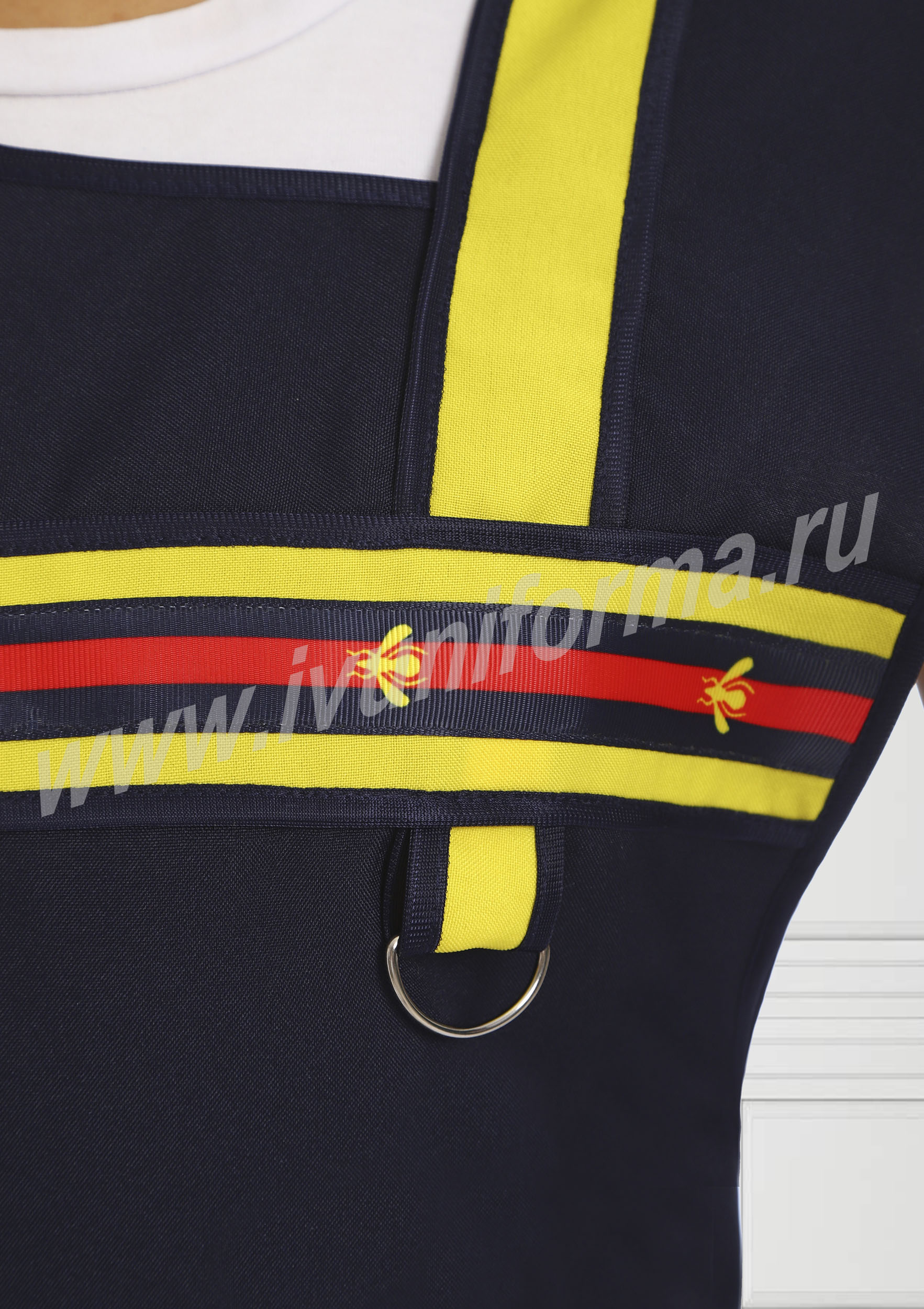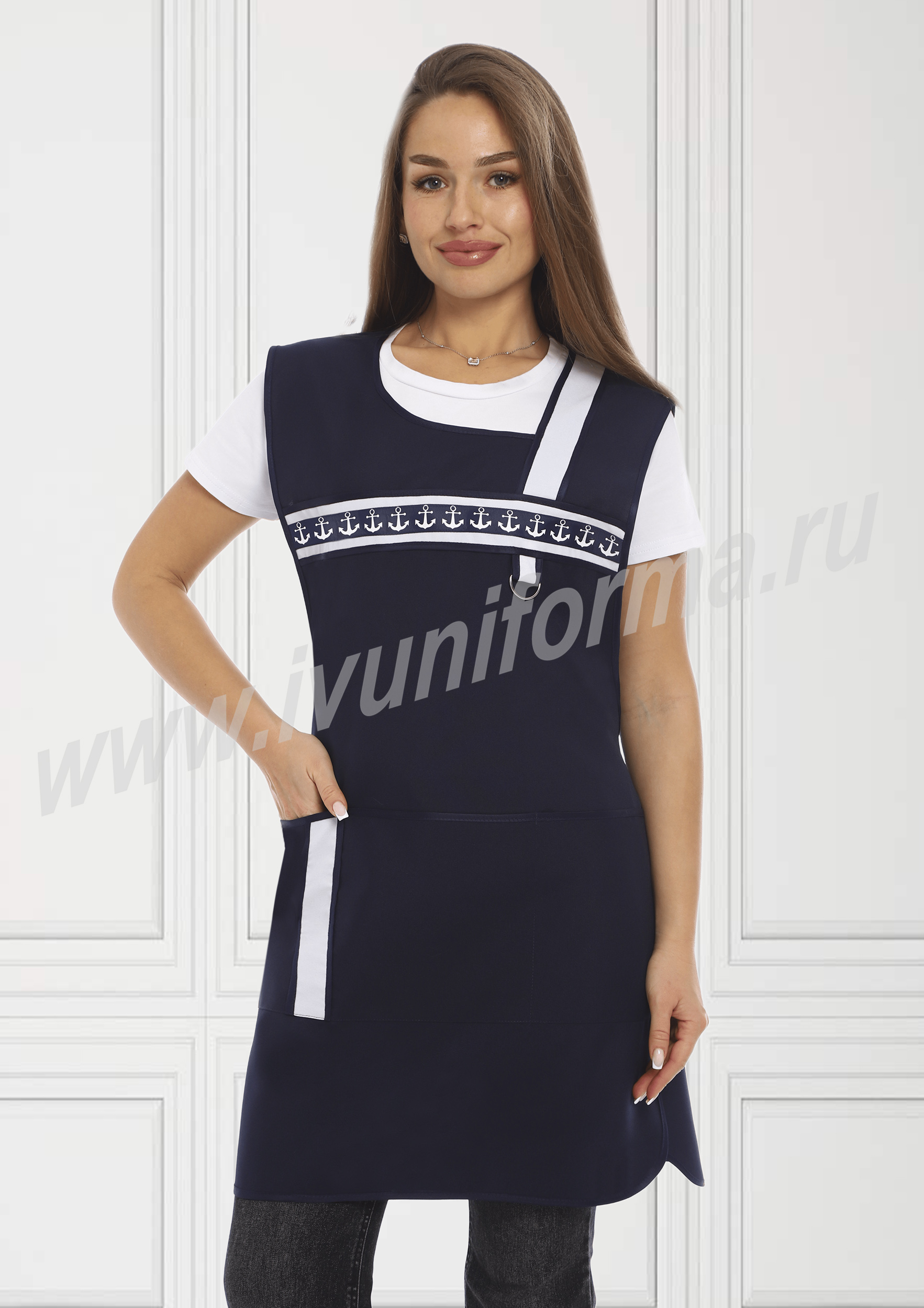 Фартук средней длины, перекидной с фигурным вырезом горловины. Спинка прямая без отделки. Полочка с отрезными асимметричными кокетками, в нижней части фартука расположен вместительный карман с тремя отделениями. Ширина фартука по линии талии регулируется завязками – полупоясами. Оригинальная отделка контрастными полосами и яркой тесьмой с принтом подчеркивает оригинальный дизайн изделия. Все срезы фартука обработаны кантом из износоустойчивой нейлоновой ткани. Фартук прост в уходе, не мнется, не линяет, удобный и практичный, предназначен для защиты от общих производственных загрязнений.