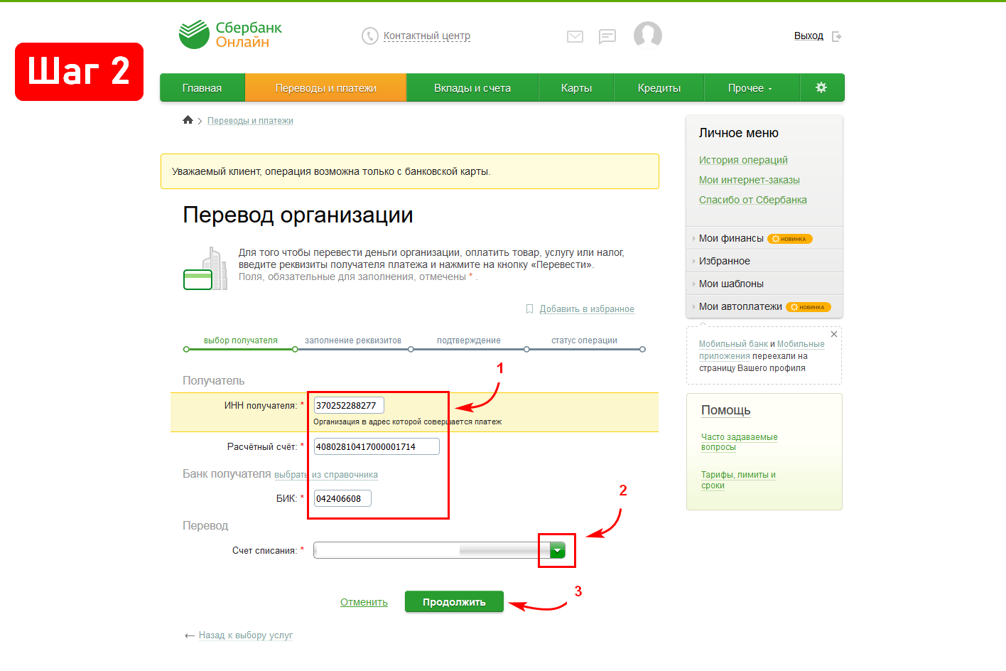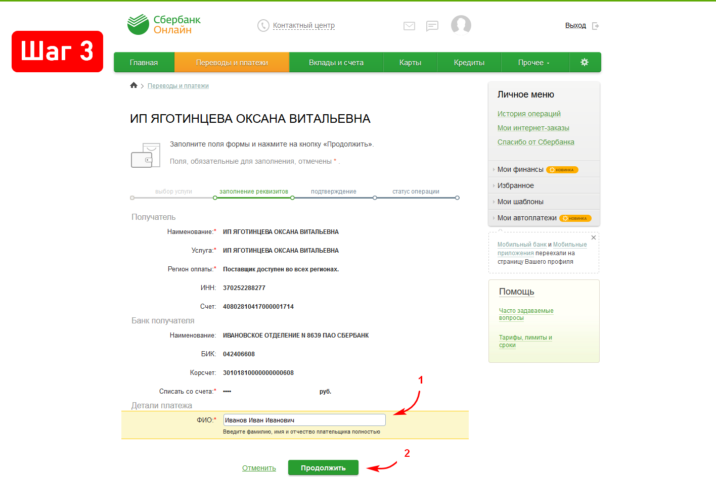 3. Теперь необходимо ввести ФИО плательщика, назначение платежа и указать сумму для оплаты счёта. После заполнения каждого поля требуется нажать на кнопку «Продолжить». В поле «Назначения платежа» укажите номер счёта и дату его выставления.